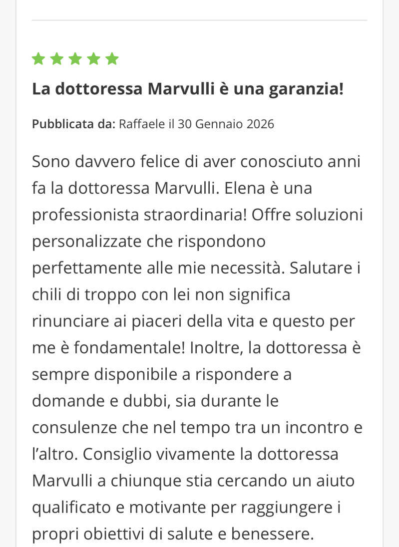 Con la consulenza nutrizionale personalizzata, Dott.ssa Elena Marvulli vi guiderà nella scoperta di un'alimentazione consapevole, adattata alle vostre esigenze e preferenze.